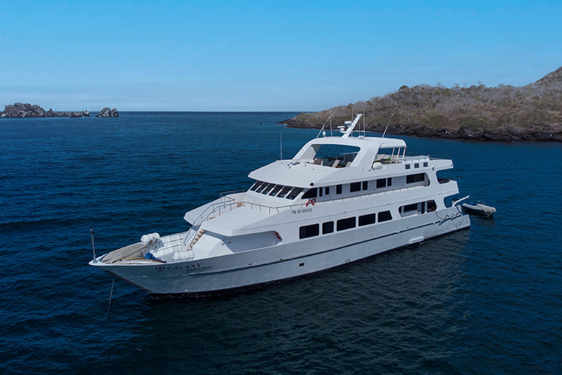 Live a unique experience and explore the Galapagos Islands aboard our renewed Galaxy Yacht Cruise, exclusivity and personalized service for your dreamed trip while exploring the Enchanted Islands. This boat is 114.82 feet long by 24.93 feet wide and it carries up to 16 passengers in 8 cabins with 8 crew members.  The boat features a lower deck , main deck, upper accommodation deck and top sundeck.