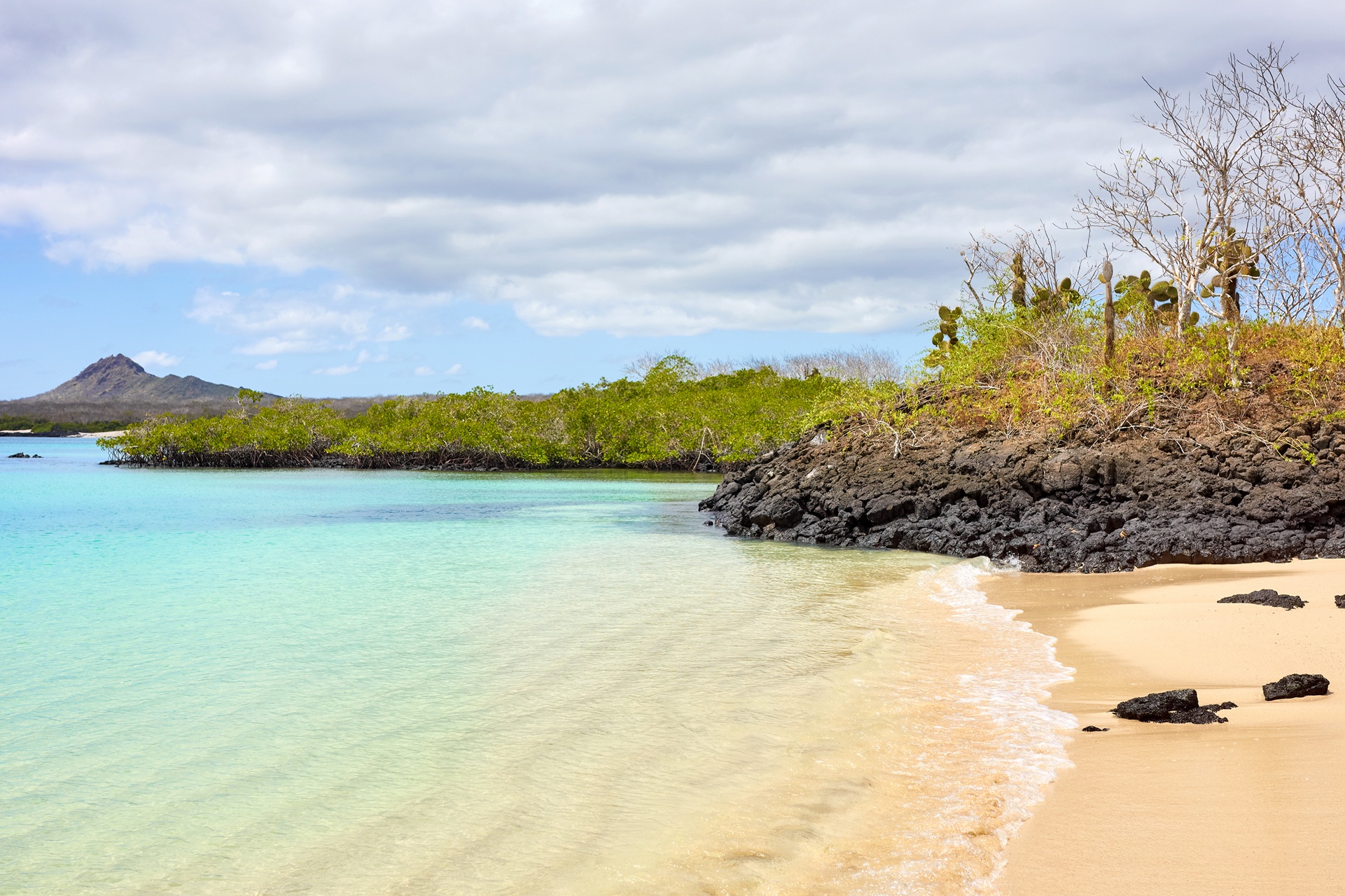 Named for its distinctive cone shape, Chinese Hat is a small islet separated from Santiago by a narrow channel, forming one of Galapagos’ most picturesque bays. Its turquoise waters, coral-sand beaches, and volcanic rocks create a stunning landscape. A coastal trail leads you through a sea lion colony, while on the lava rocks, you may spot penguins resting. Snorkel into the crystal-clear waters of Chinese Hat and marvel at the vibrant colours of the fish. Spot sleek reef sharks and, if lucky, a penguin darting through the water like a swift underwater torpedo chasing anchovies. Located on Santa Cruz’s northern coast, Dragon Hill is the only place on the island where land iguanas roam freely. As you explore this unique ecosystem, you’ll also spot a saltwater lagoon where flamingos, ducks, and shorebirds often gather.